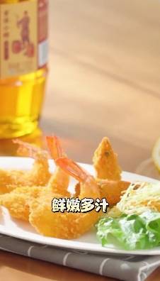 做這道菜用到的食材很簡單,隻需要準備鮮蝦、面包糠、雞蛋液和胡姬花花生油。首先,剝去蝦殼,保留蝦尾,把蝦從中間剖開,用刀背輕敲幾下,把蝦裹滿雞蛋液和面包糠。接下來倒入半鍋胡姬花花生油加熱,油熱後把蝦放進去炸,讓面包糠一點點變酥。等到蝦變成金黃色就可以撈出來吸油裝盤瞭,還可以按照自己的喜好搭配生菜葉或芝士絲享用,更味道更加豐富。