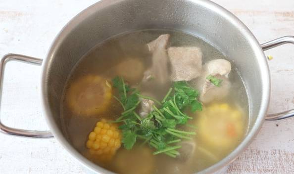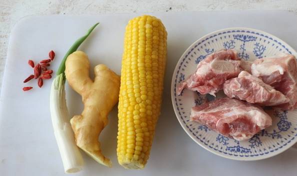 排骨300克、玉米一根、蔥一根、薑5片、枸杞10克、鹽少許、香菜少許