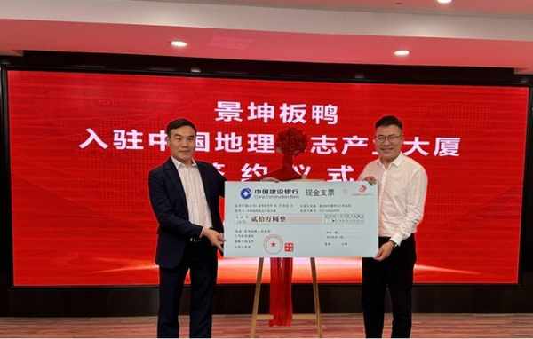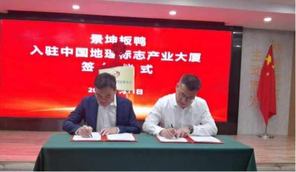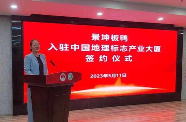 山東省地理標志產業協會秘書長張忠代表中國地理標志產業大廈運營方與景坤板鴨公司簽約