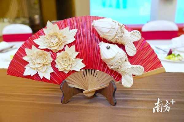 餐桌上這把葵扇寓意“花開富貴”“年年有餘”。