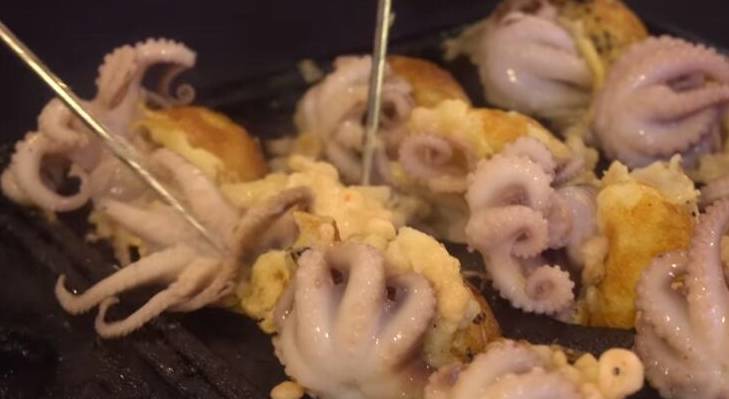 等面糊凝固後,然後再把準備好的八爪魚放在面糊裡,再用一個筷子不停的翻動鍋裡的面糊八爪魚,直到把八爪魚煎熟透位置。