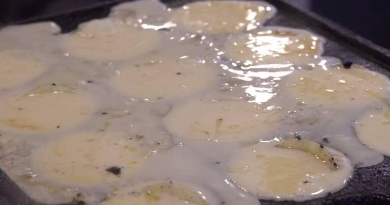 這道小吃做法獨特,是用面糊做成的,說到面糊,大傢一定不會陌生,現在街邊的小吃很多都離不開面粉,無論是油炸還是清蒸都可以做成好吃的小吃,大爺把調好的面糊舀在鍋裡。