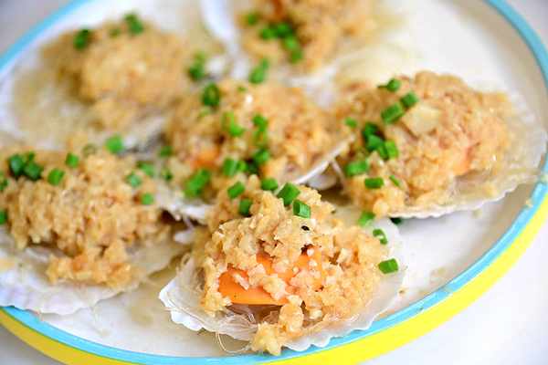 粉絲蒸扇貝,貝肉大顆飽滿,鮮美滋味和蒜香完美融合,連粉絲一同送入口中,贊不絕口!