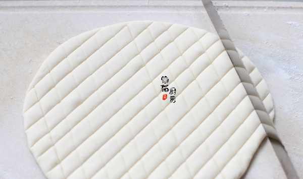 4.取一份面團劑子,在案板上撒上適量幹粉防粘,然後用搟面杖把面團搟開成圓形。厚度大約是1根筷子樣的厚度。然後用刀背縱橫交錯的在面團上按壓成斜紋狀(如圖)。也別太用力瞭,否則容易把面團切斷喲。