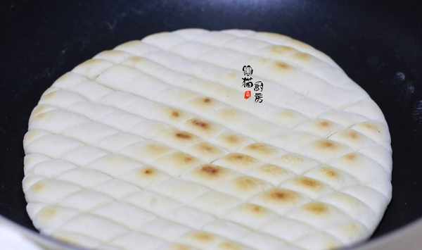 5.不粘鍋小火加熱,把按壓有花紋的面餅直接放入不粘鍋中,蓋上蓋子,小火烙至兩面微微焦黃。不用放油,小火幹烙即可。