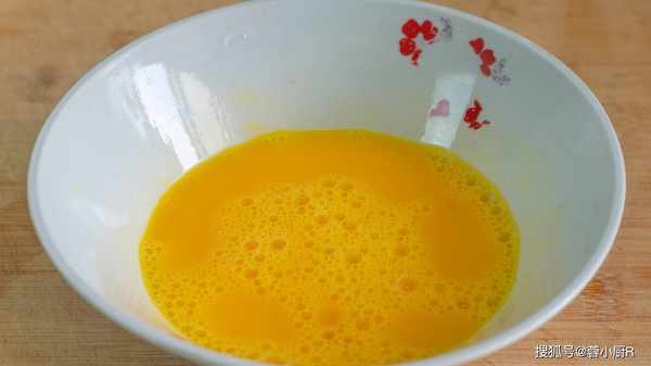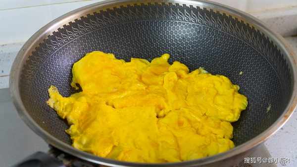 4、起鍋熱油,倒入蛋液,用鍋鏟推動的方式煎蛋,蛋液凝固後翻個面,煎到雞蛋微微有點焦黃就可以瞭,然後盛出來備用。