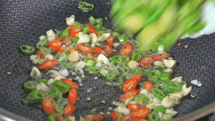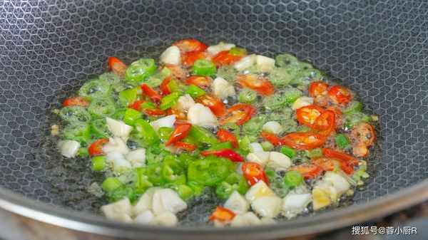 7、起鍋熱油,下蔥蒜小米椒,先炒出蒜香味。