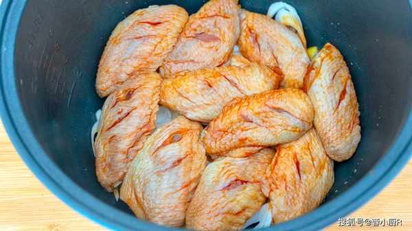 1、雞翅中間劃開,用開水煮十五分鐘左右,目的是為瞭去除腥味;然後撈出瀝幹水分後放入一定量的鹽、雞精、雞汁、料酒、醬油,蔥、薑、蒜醃制20分鐘;