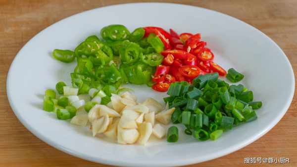 5、青椒2個,洗凈後去籽切成小丁;小米椒3個,洗凈後切成小圈圈。不能吃辣椒的可以不放;小蔥2根,洗凈後切蔥花。蔥白和蔥綠記得分開裝;大蒜半頭,剝殼後切片。