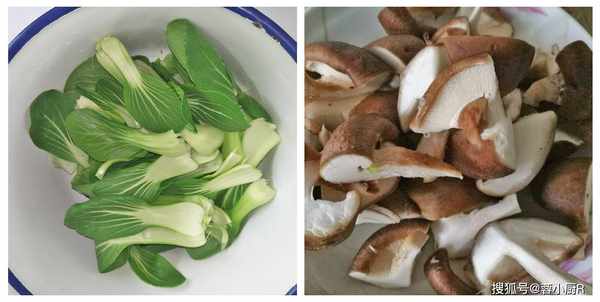 2、香菇柄單獨切下來,大菇傘一切3瓣,小菇傘一切2瓣,油菜葉子一次掰下來;