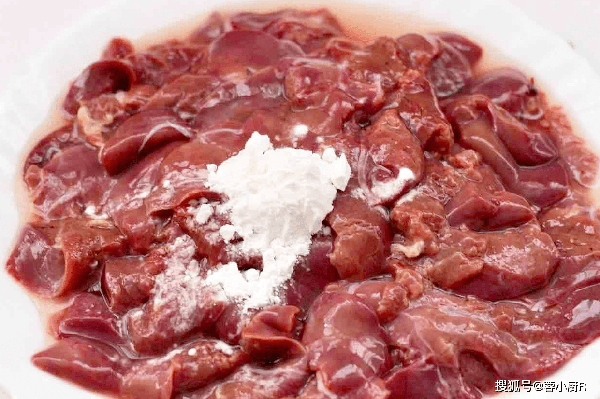 3、雞肝中加入料酒、淀粉抓勻,醃制5分鐘