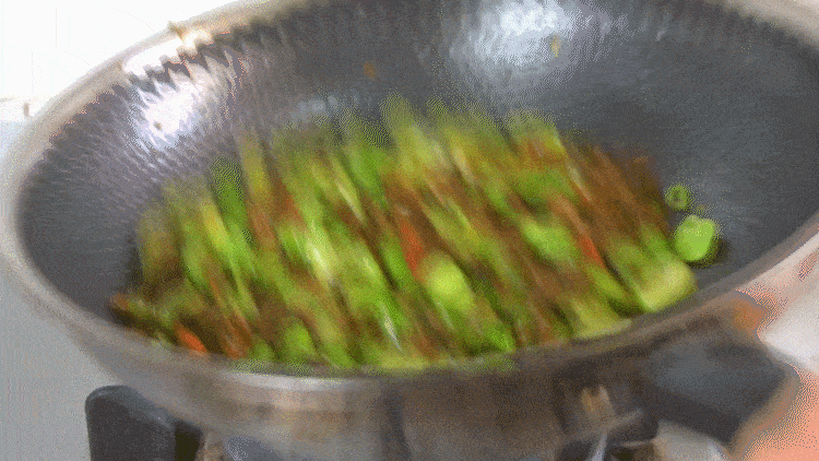 8、然後把毛豆倒進來炒,大火爆炒一分鐘後倒入外婆菜和雞蛋。