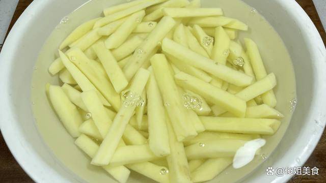 3、在鍋中倒入足夠的清水,大火燒開。將土豆條倒入水中,煮約1分鐘,直到土豆條五分熟。然後使用笊籬撈出土豆條,放入涼水中過涼。這一步非常重要,它能使土豆條更加酥脆,避免炸制過程中變得軟趴趴。瀝幹土豆條:將過涼的土豆條撈出,放入一個漏眼的容器中,使其瀝幹表面的水分。這樣處理後的土豆條就成為瞭半成品的薯條。