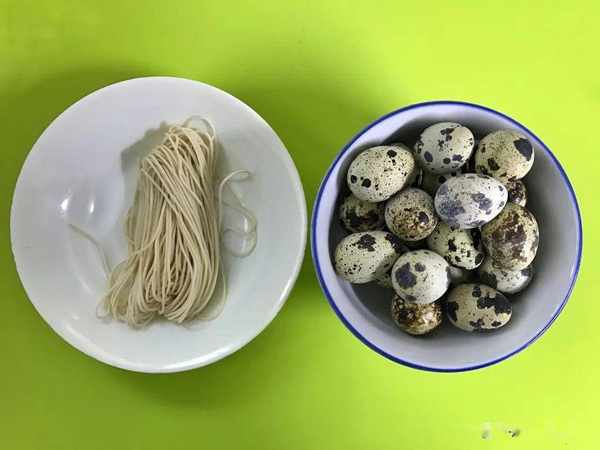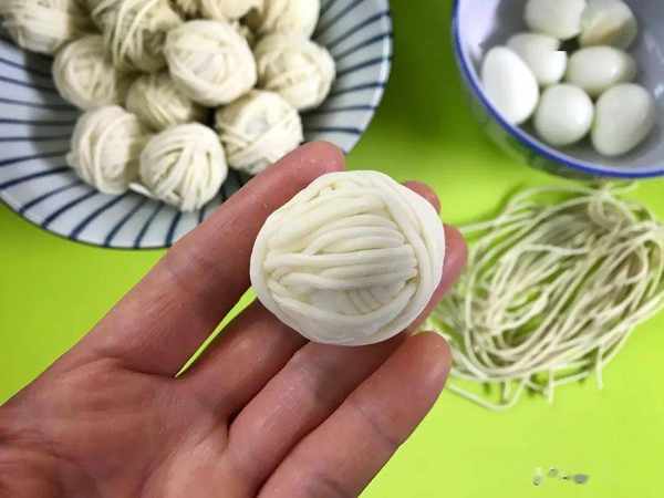 [2] 把面條一圈圈纏在鵪鶉蛋上,做成鳥巢的樣子(面條沾水會更好纏)。