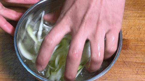 3、大蔥切成蔥絲,生薑切成蔥絲,放入碗中加入料酒,開水浸泡一下,抓擠制作蔥薑水