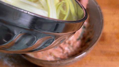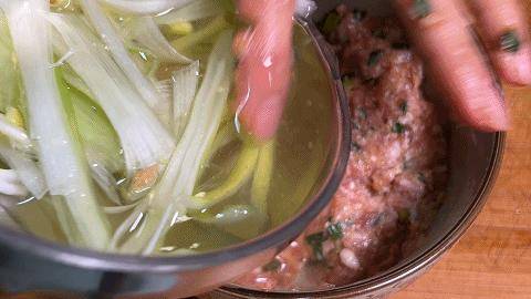 6、蔥薑水分三次加入,讓餡料吸收水分,然後邊攪拌邊摔打