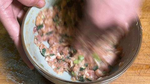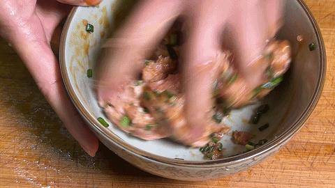 10.第一次加入蔥薑水,用手朝著一個方向攪動,吸收水分