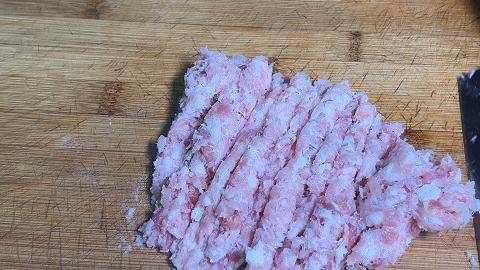 4.5分鐘後用手抓一下,將肉餡放到案板上,加上蝦皮