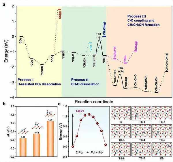 據劉小浩教授介紹,這項研究構築的雙鈀活性位點具有獨特的幾何和電子結構,能夠實現二氧化碳加氫定向生成單一產物乙醇,方法簡單,產出較高,有大規模工業化應用前景。