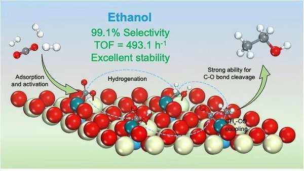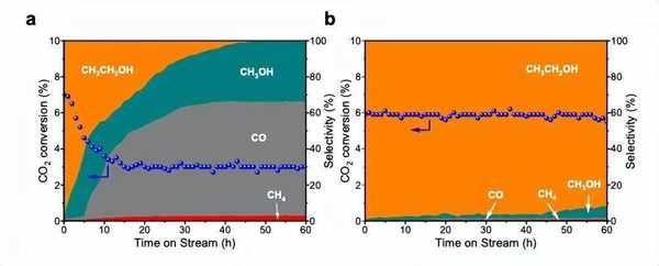 報道稱該催化劑在這種模式下能夠實現將二氧化碳在溫和條件下(3MPa,240℃)近100%選擇性高效穩定地轉化為乙醇,如此高純度的酒精是很難用其他方法被制備出來的。