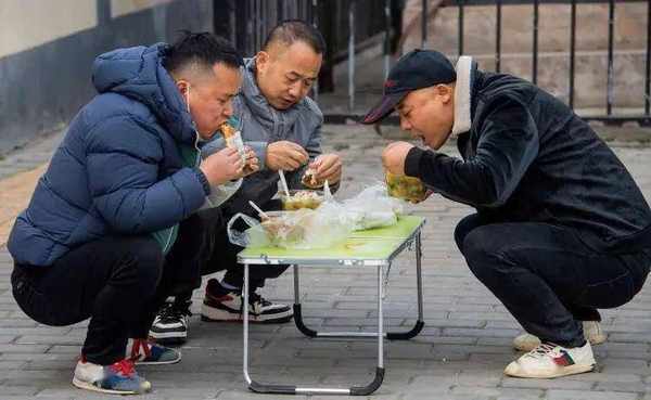 2022年1月20日,西安。人們蹲在路邊喝胡辣湯。/ 視覺中國