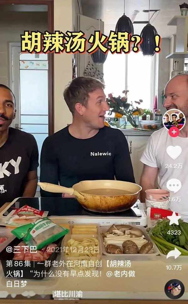 外國抖音博主“三下巴”自創“胡辣湯火鍋”,當他用河南口音喊出“乖乖咧!”,河南本地人也不得不被這個吃法驚艷。同時,河南人的一波“胡辣湯火鍋”美食文化輸出,直接將其送上抖音熱門話題榜,獲2885.9萬次播放量。