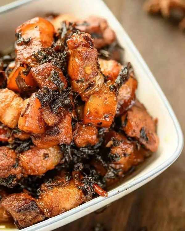 無論江浙的黴幹菜捂肉、客傢人的梅菜扣肉、湖北的幹菜燜肉、川渝的芽菜蒸肉,它們都是中國紅燒肉譜系上的重要成員。醃菜幹裡的糖類、氨基酸鹽,為肉提供瞭鮮味物質、著色物質和咸味;肉在烹飪中溢出的油脂,則浸潤得醃菜幹又潤又香。 天造之合。