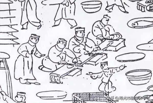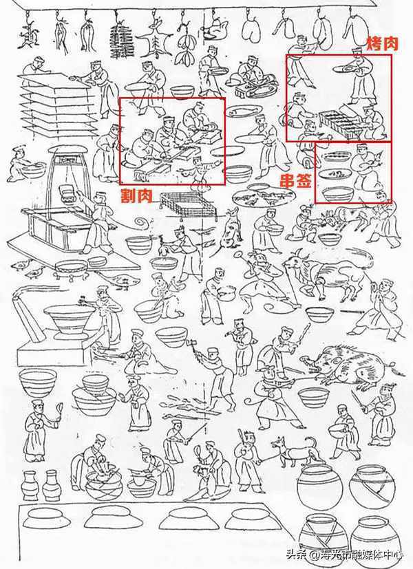 1967年春,在峽山出土瞭一塊石刻,描述瞭東漢北海都鄉安持裡的孫傢大院裡,40多位傢廚正在準備一場盛宴。其中最引人註目的是,3位傢廚正在割肉,4位傢廚正在串簽、扇風、烤串,一套動作下來行雲流水,從圖中看去,和如今的烤串已頗有幾分相似。