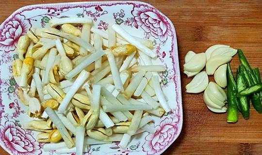 花生芽去掉花生上的紅衣,洗凈,切成3-4厘米的小段;三瓣大蒜切片,一個線椒切滾刀;
