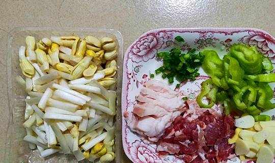 花生芽去掉花生上的紅衣,洗凈,切成3-4厘米的小段;肥、瘦肉200克洗幹凈切片;一個青椒洗凈切圈;生薑大蒜少許切碎;香蔥一根切碎;
