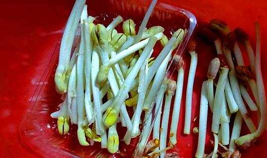 芽菜有很多種,但我們這裡平時吃的比較多的就隻有綠豆芽和黃豆芽,也是我們這裡很多人都喜歡的食材之一,芽菜都有一個共同的特點,就是嫩,一掐就斷,手上都是豆芽汁;