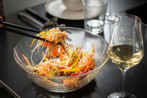 肥美三文魚搭配清爽蔬菜絲,滴上色拉油攪拌,滋味醇厚。是非常值得推薦的一道前菜,清爽不膩,和任何湯底都是好的搭配。