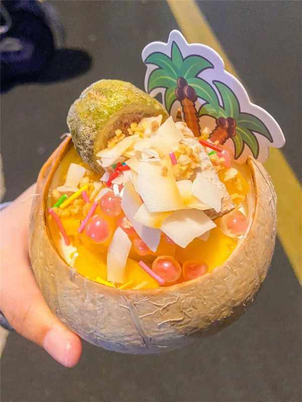 一整勺滿滿配料入口,椰子片、芒果、爆珠、無花果幹...每一個料都有獨特的味道,配上椰子凍一起咀嚼,這種甜入心扉的感覺,實在太妙瞭。