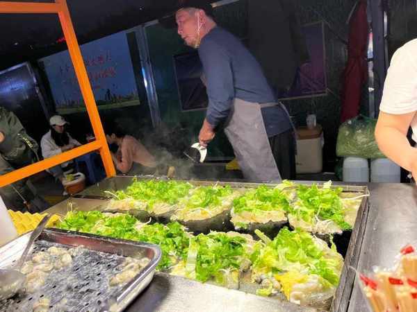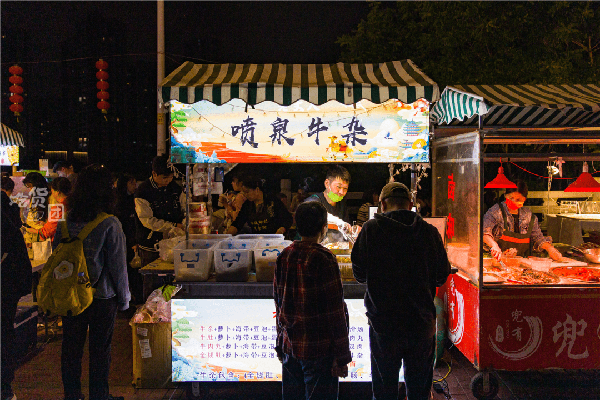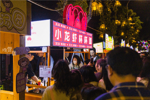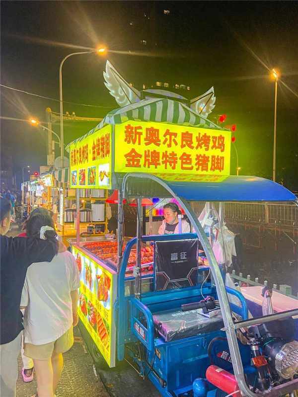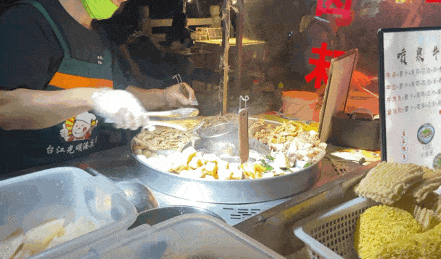 在街邊一眼望去,各色美食攤位依次排開,鹵味、串串、烤魷魚、烤冷面、涼皮、蚵仔煎、牛雜、小龍蝦…閃爍的招牌下,誘人的香味不斷催化多巴胺,忍不住想一傢一傢吃過去。