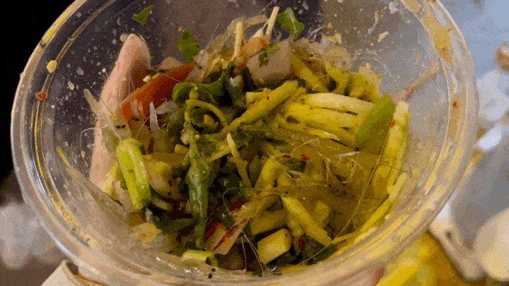 這傢小攤主打涼拌生醃跳跳蝦,人氣超火爆,我排隊約1h才拿到。到手後,跳跳蝦肉眼可見的新鮮,在碗裡還活蹦亂跳的呢。味道對於我來說沒有很驚艷,醬汁太過酸甜掩蓋瞭海鮮原本的鮮甜,更適合獵奇寶寶購買。