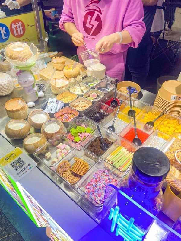 這個小小的攤位可是裝載著整個夜市的五彩斑斕, 用椰肉做底,加入各式各樣甜甜的配料,一杯造型精美的椰子凍拿在手上,在人來人往的夜市街頭,妥妥的回頭率單品。