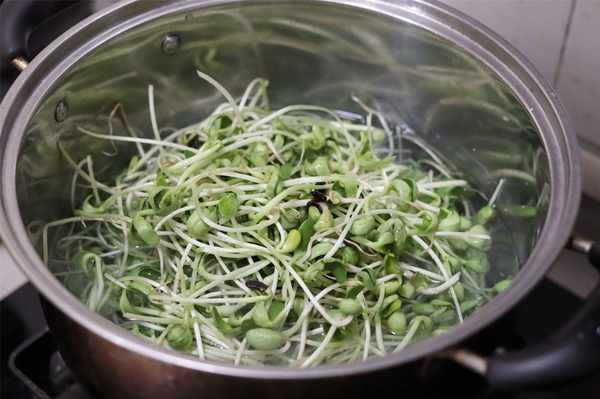 第二步:鍋中適量的水,加入一勺鹽,煮開以後將黑豆苗倒入鍋中焯水。