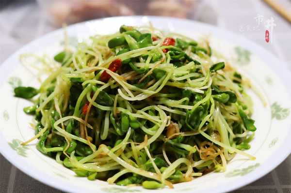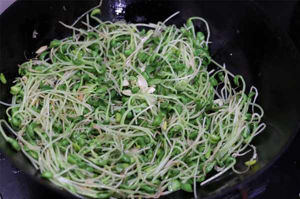 第五步:將豆苗倒入鍋中,大火翻炒片刻,加入2勺生抽,適量的鹽,翻炒均勻即可出鍋。