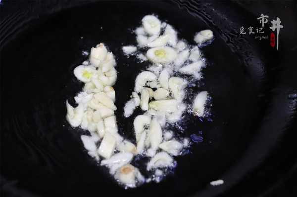 第四步:炒鍋中少許油,加入一把蒜瓣中小火炒出香味。