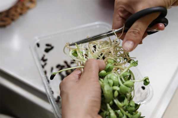 第一步:黑豆苗買來以後,不要打亂,將其抽出以後將根部依次剪掉,放入清水中清洗幹凈。