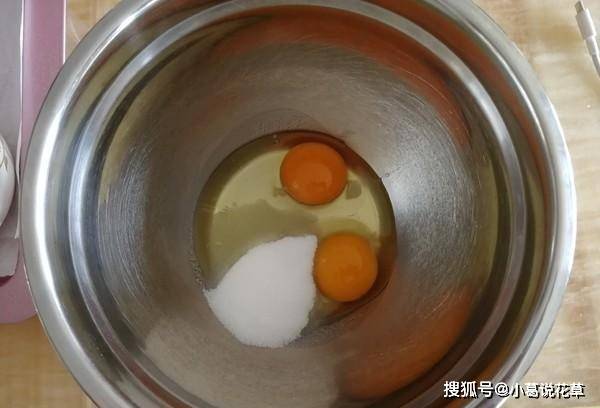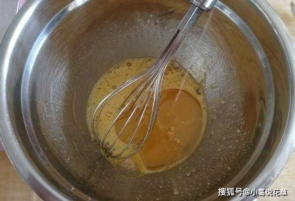 2、將整個雞蛋汁倒入一個幹凈的容器中,不要加水。我用的是草蛋,兩個就夠瞭。加入砂糖,用手持攪拌機攪拌均勻。先讓糖融化。