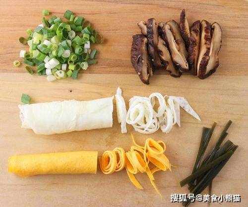 6、蔥切成蔥花、香菇切片、昆佈切絲備用。蛋分別煎成蛋白皮及蛋黃皮,放涼切絲備用。