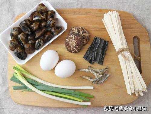 主料:面條160g 蛤蠣20顆 香菇2朵 小魚幹10隻 昆佈2小片