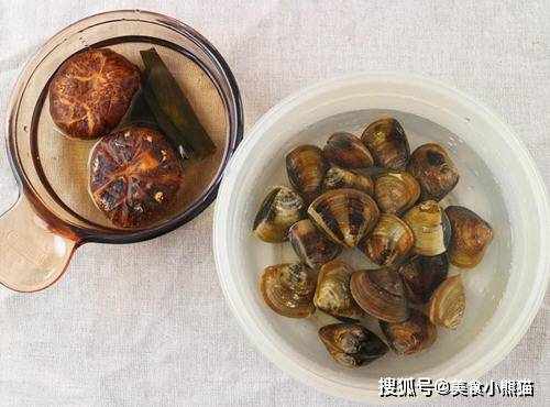 3、蛤蠣先泡水吐沙,使用幹香菇請先泡水,昆佈也先泡水備用。