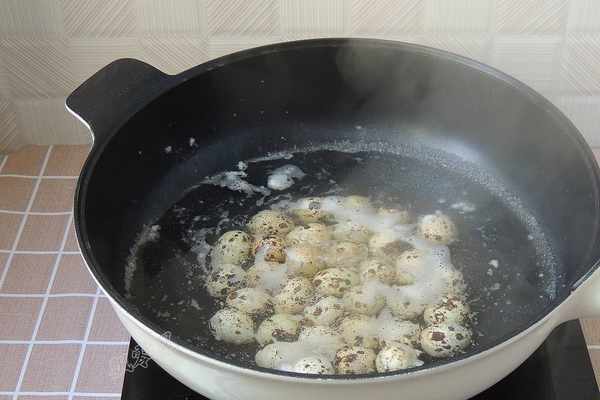 2.炒鍋中加入清水,將鵪鶉蛋放入鍋中煮熟。鵪鶉蛋要冷水直接入鍋煮,而且水裡要加入一小勺鹽,鹽可以加速蛋白的凝固,煮的時候不容易破裂。