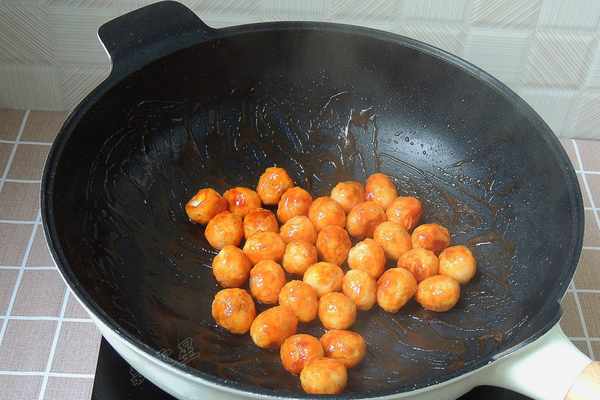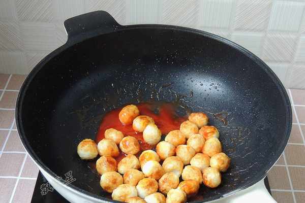 9.將鵪鶉蛋重新倒回鍋中,用鍋鏟翻拌均勻,讓每一顆鵪鶉蛋表面都包裹著番茄醬汁。