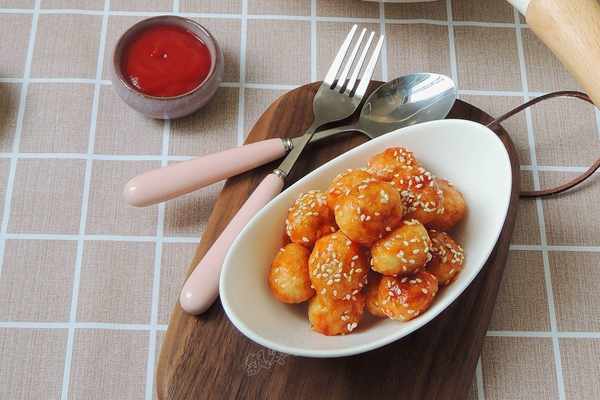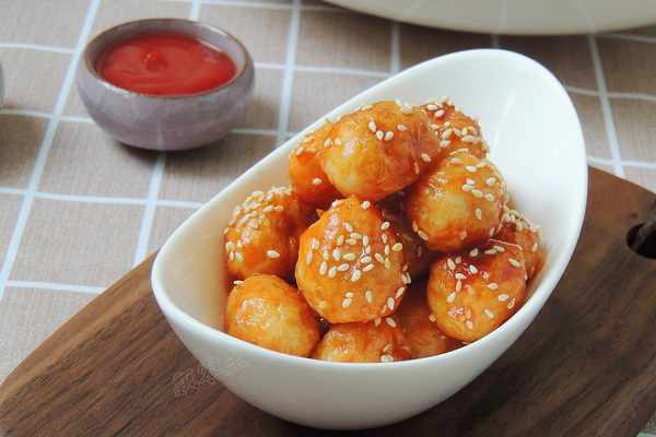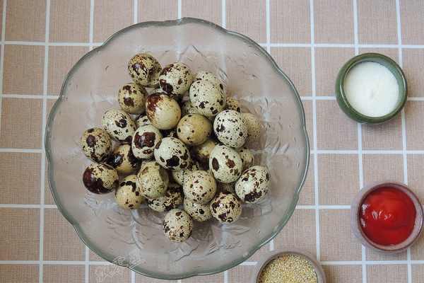 【食材】:鵪鶉蛋500g,番茄醬2大勺,白砂糖1勺,白醋1小勺,鹽小半勺,色拉油2勺,熟白芝麻1小把。