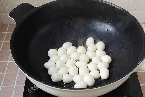 5.鍋燒熱,放入一大勺色拉油,油熱以後,將鵪鶉蛋倒入鍋中。