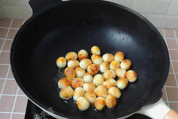 6.保持中小火,將鵪鶉蛋的表面煎至顏色金黃,表皮起皺,盛入碗中備用。外面店裡都是起大油鍋炸的,傢裡做的話,用煎的就可以瞭。煎鵪鶉蛋的時候,要註意火候,而且鵪鶉蛋會濺油,小心燙傷。