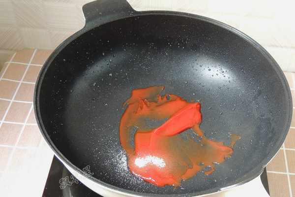 7.煎過鵪鶉蛋之後的油留在鍋裡,小火加熱,加入兩大勺番茄醬和一勺白砂糖,翻炒至白砂糖融化。